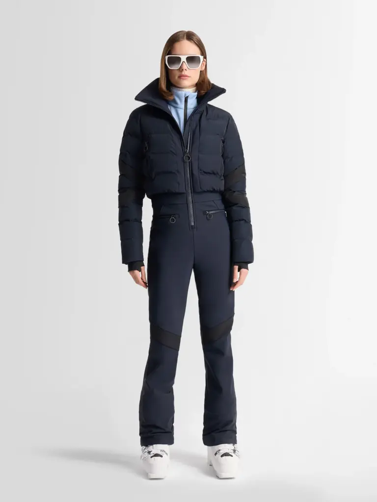 Wide-fit tulumlar, renk bloklu montlar, yüksek bel termo taytlar, oversized kürksüz yakalar ve ayna yansımalı gözlükler bu görünümün temel parçaları. “Dağda vintage star görünümü” yeniden öne çıkıyor.
