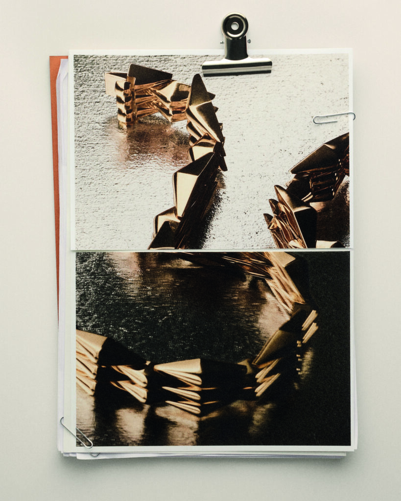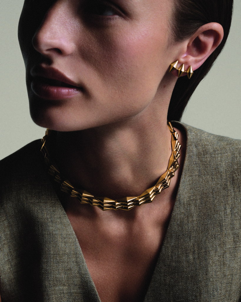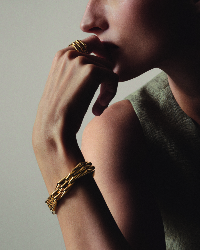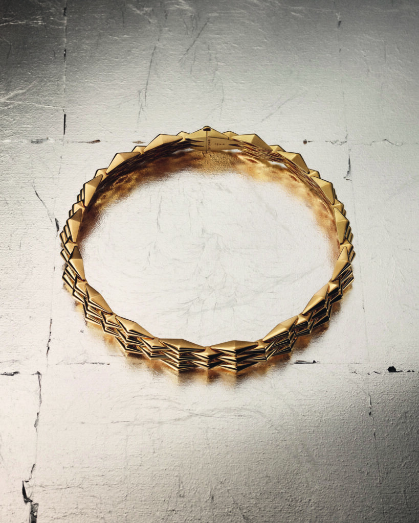 Serinin merkezinde yer alan bilezik, arşivdeki özgün mücevherden doğrudan ilham alarak ileri bir zanaatkârlık seviyesine taşınıyor. Altın bir dalga bileği sararken, eşkenar dörtgen formundaki modüller görünmez esnek bağlantılarla bir araya geliyor. Sonuç, tenle doğal bir uyum içinde hareket eden, akışkan ve dengeli bir yapı.
